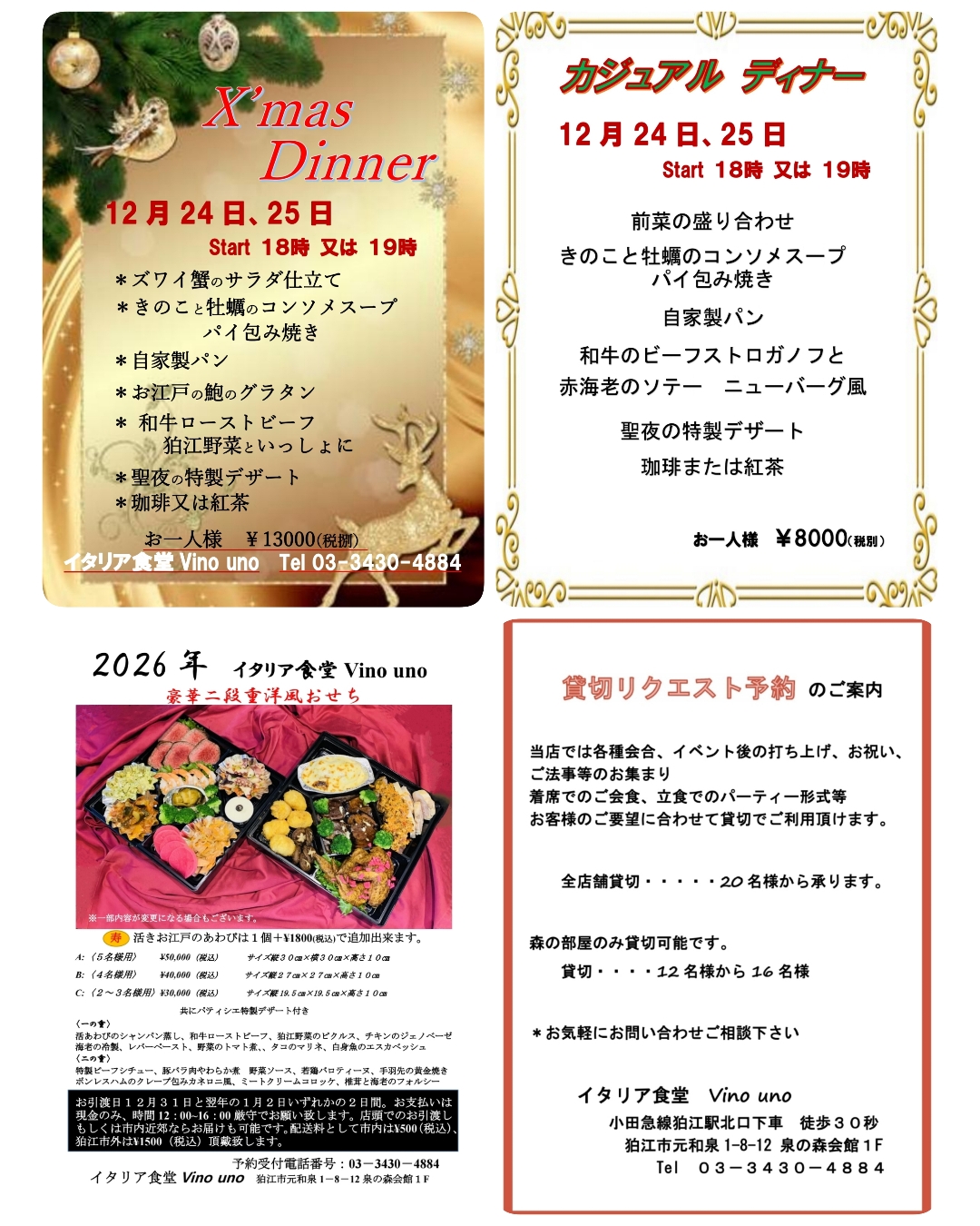 12月24日、25日のディナータイムはクリスマスディナーのみの営業です。